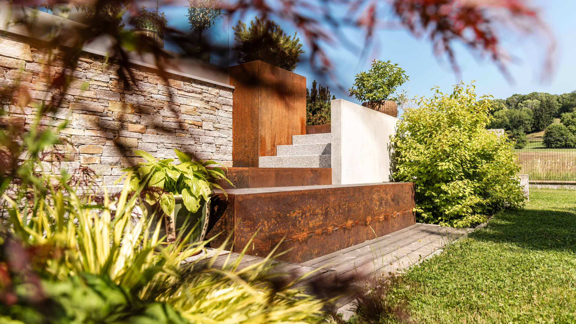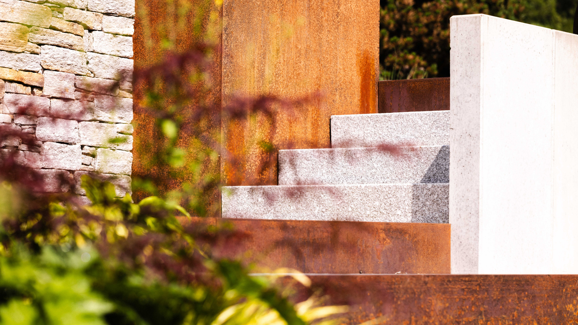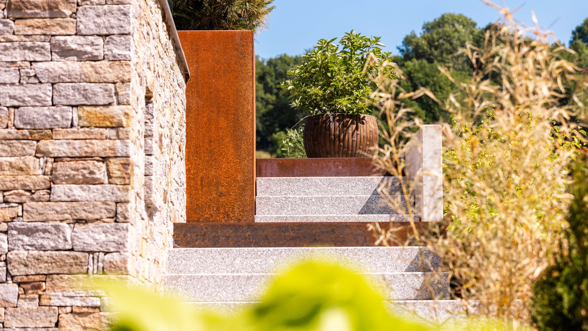 L’alliance du granit et de l’acier Corten évoquent les teintes et matériaux bruts de la nature dans un esprit de modernité champêtre.