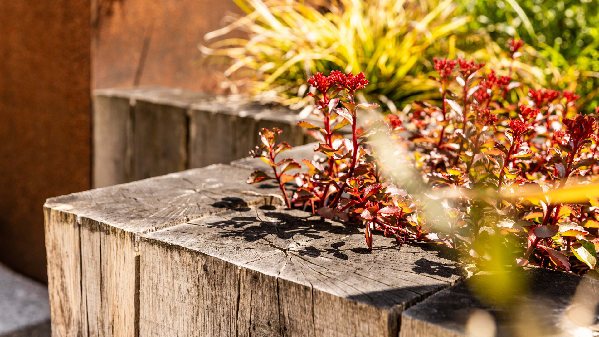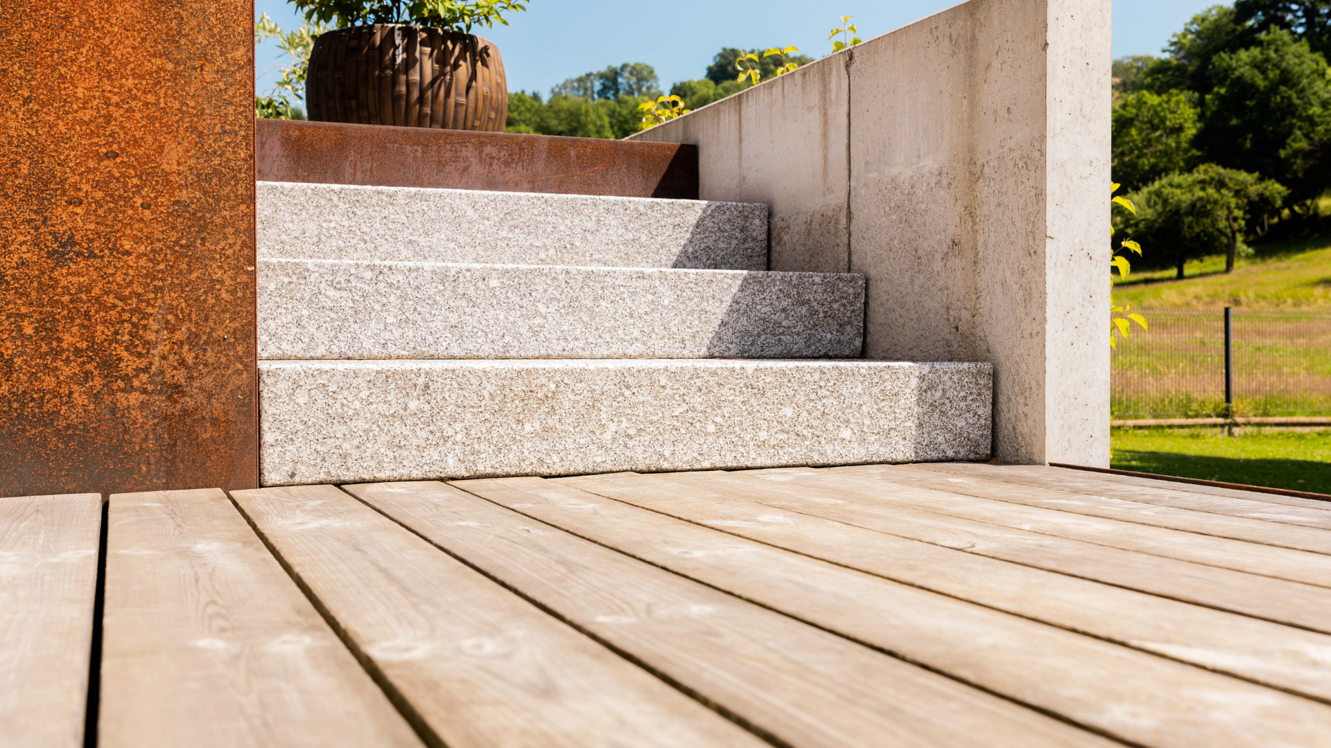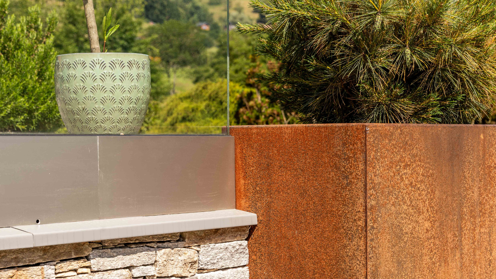 L’alliance du granit et de l’acier Corten évoquent les teintes et matériaux bruts de la nature dans un esprit de modernité champêtre.