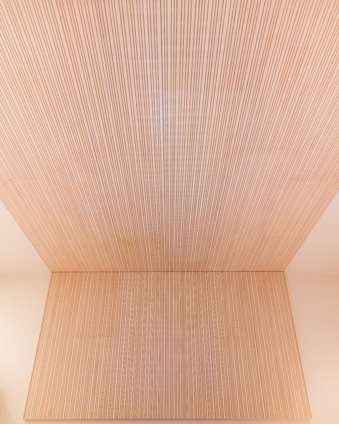 Le sauna panoramique donne sur un bassin ponctué d’une sculpture en bois allant du sol au plafond.