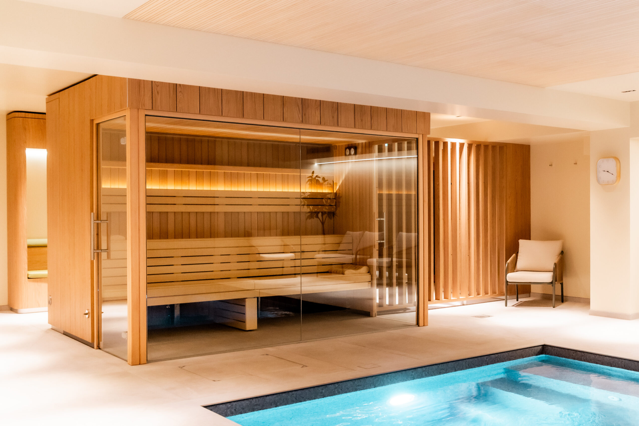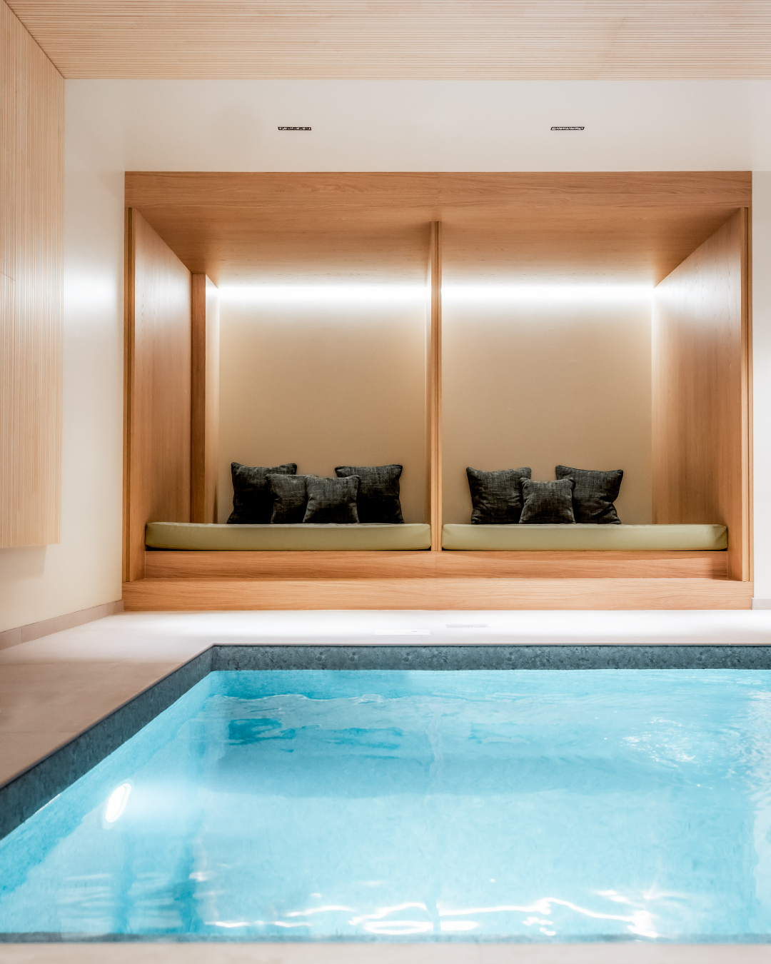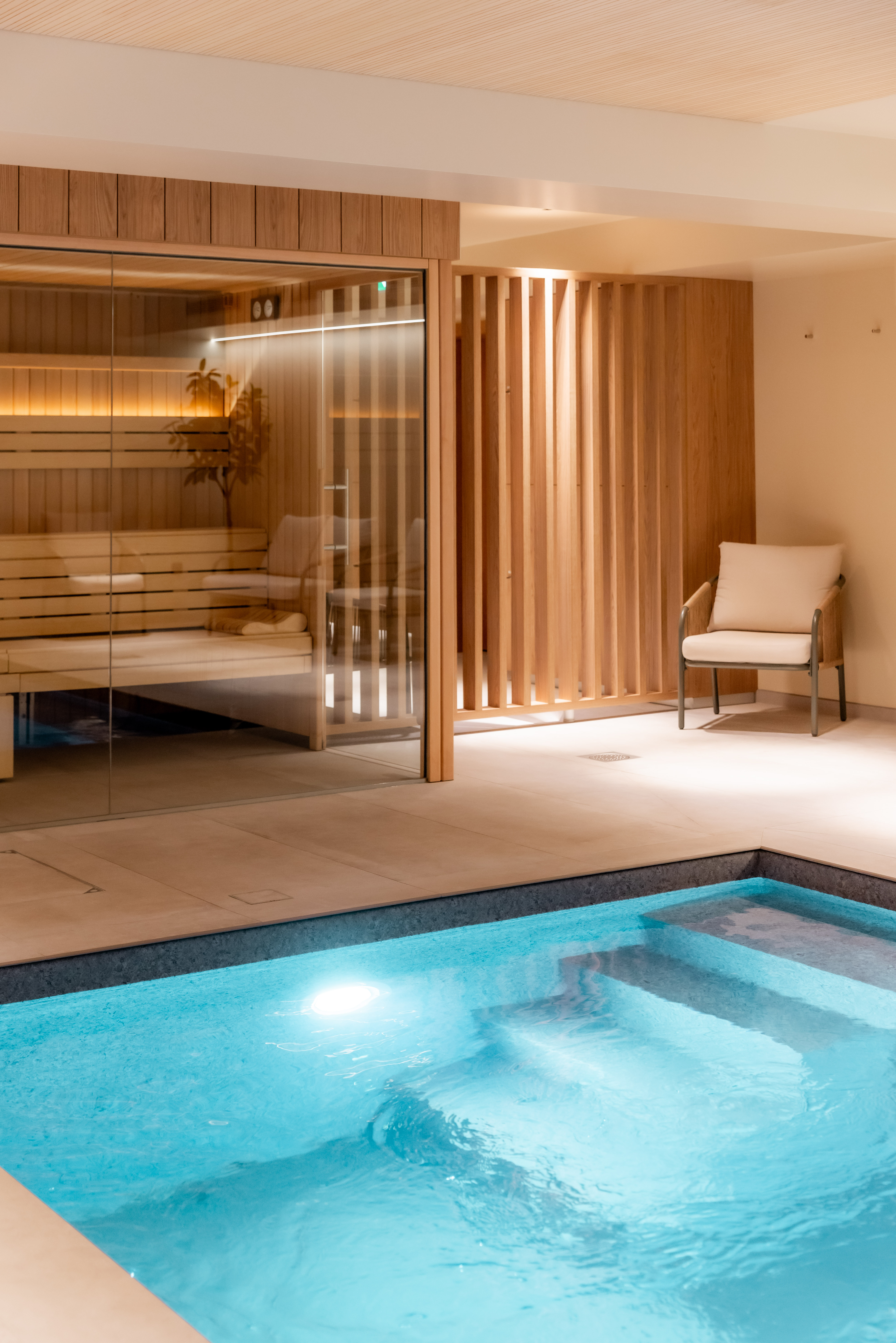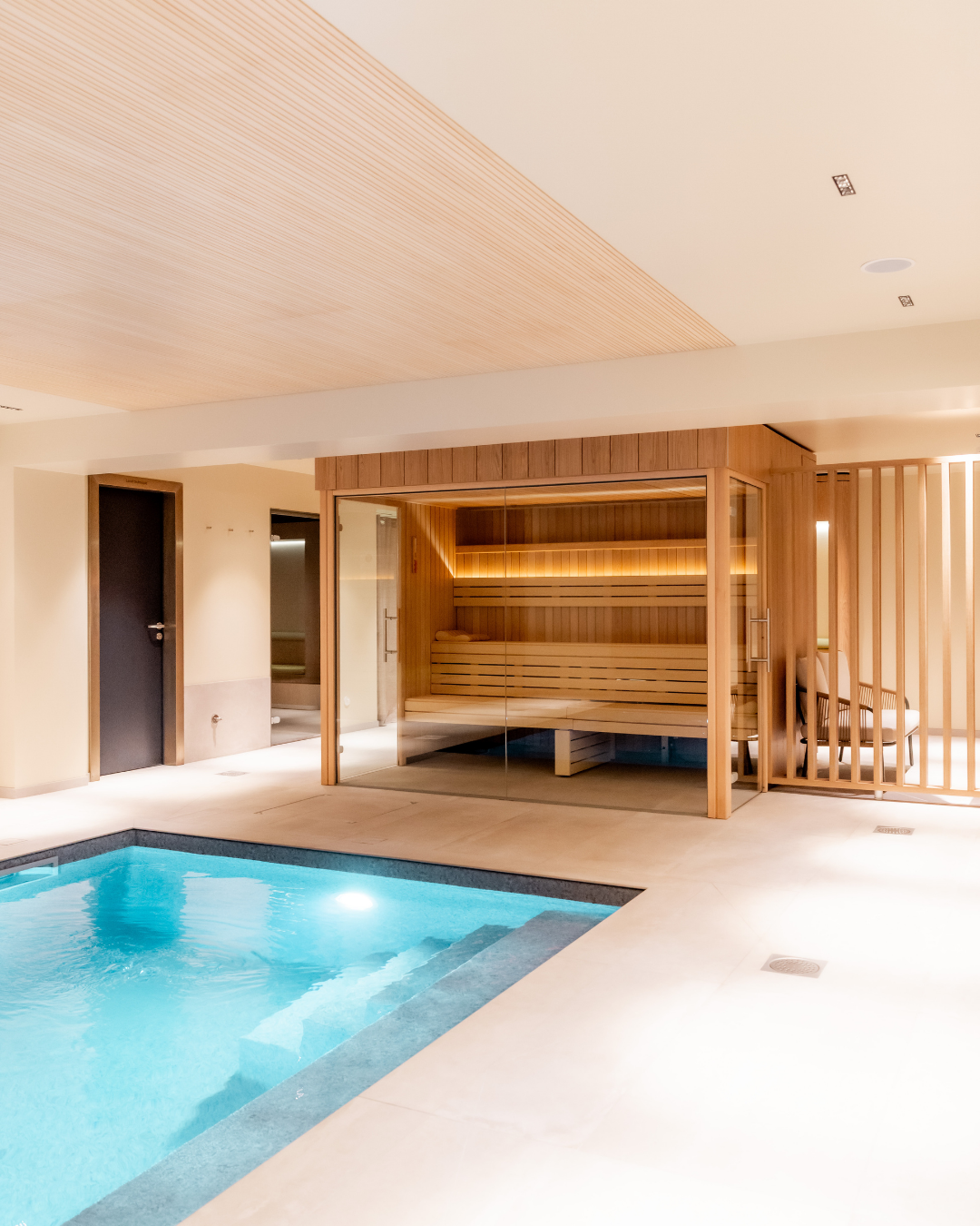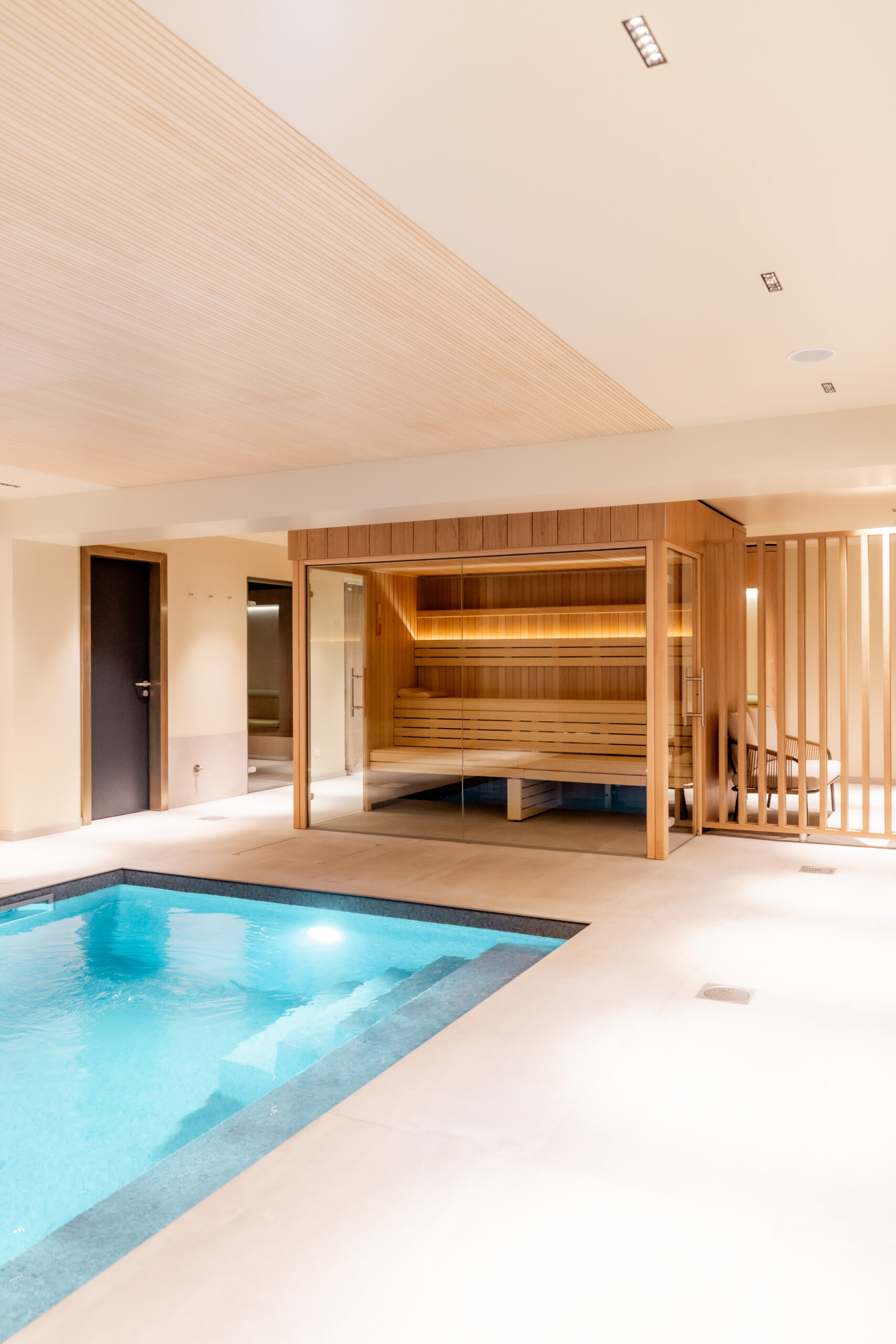 Un espace vestiaires conduit élégamment vers un agencement de tisanières et banquettes. Le parcours se poursuit au détour d’un meuble par la perspective d’accès aux installations de bien être ponctuées par une zone de repos donnant sur un bassin intérieur.