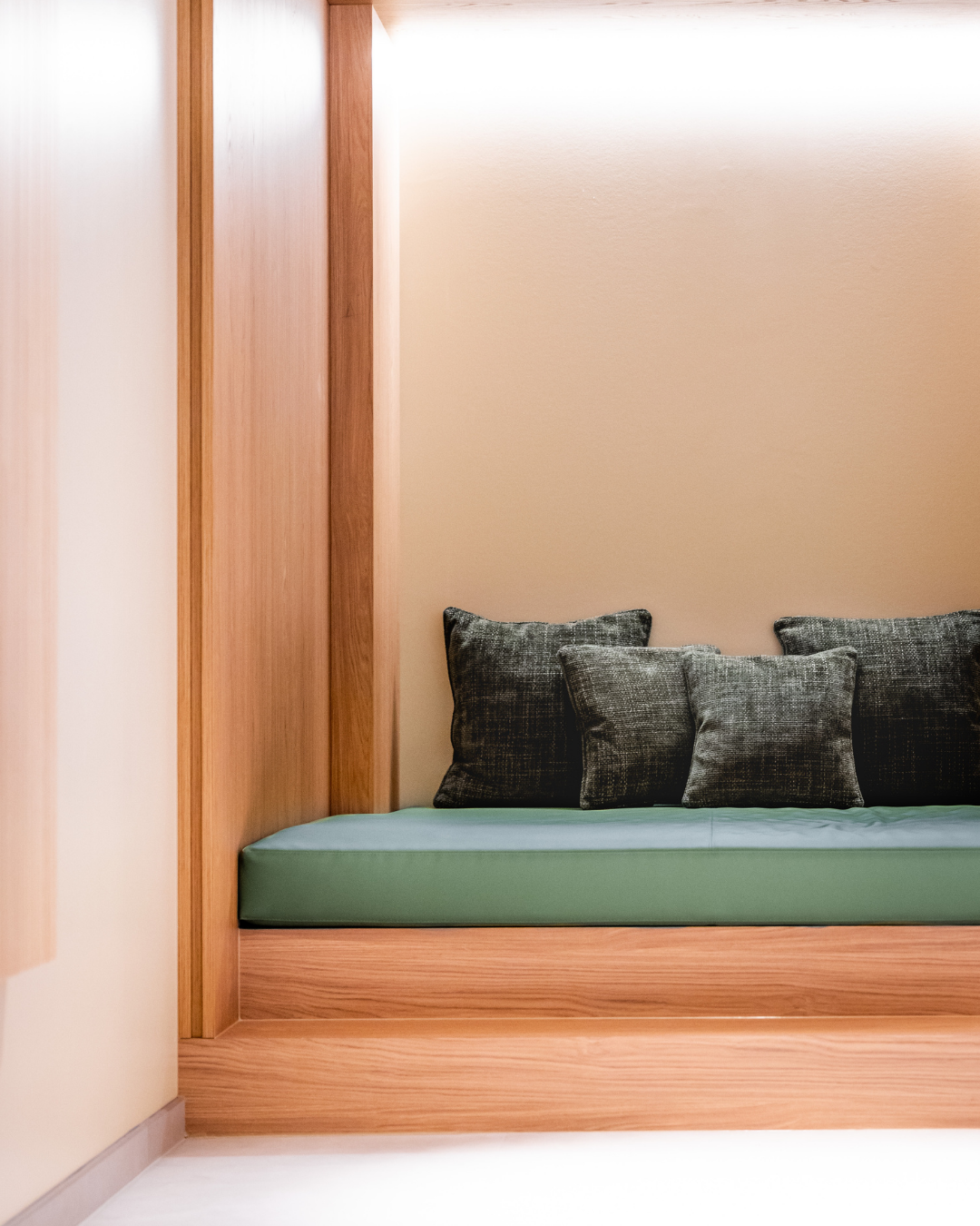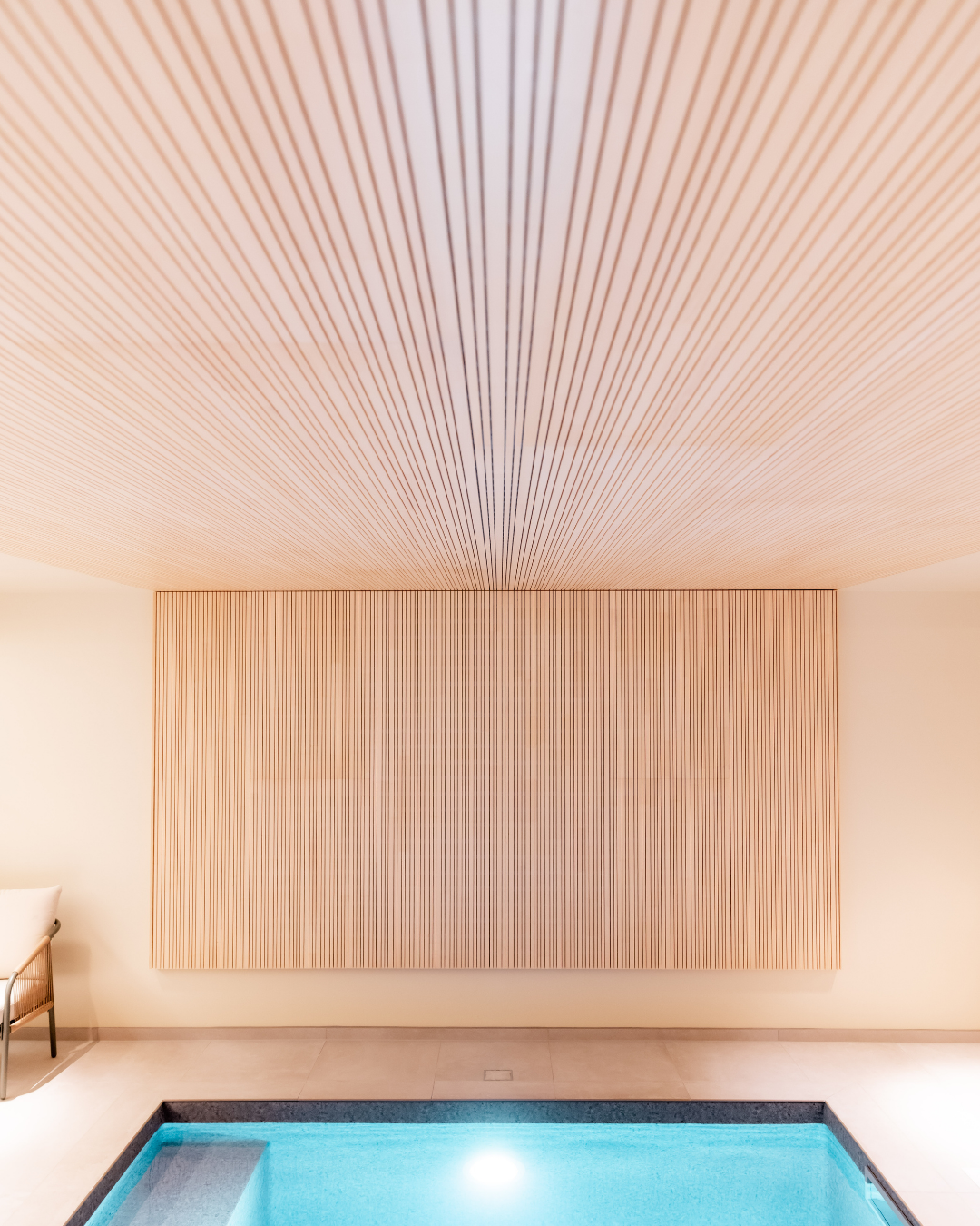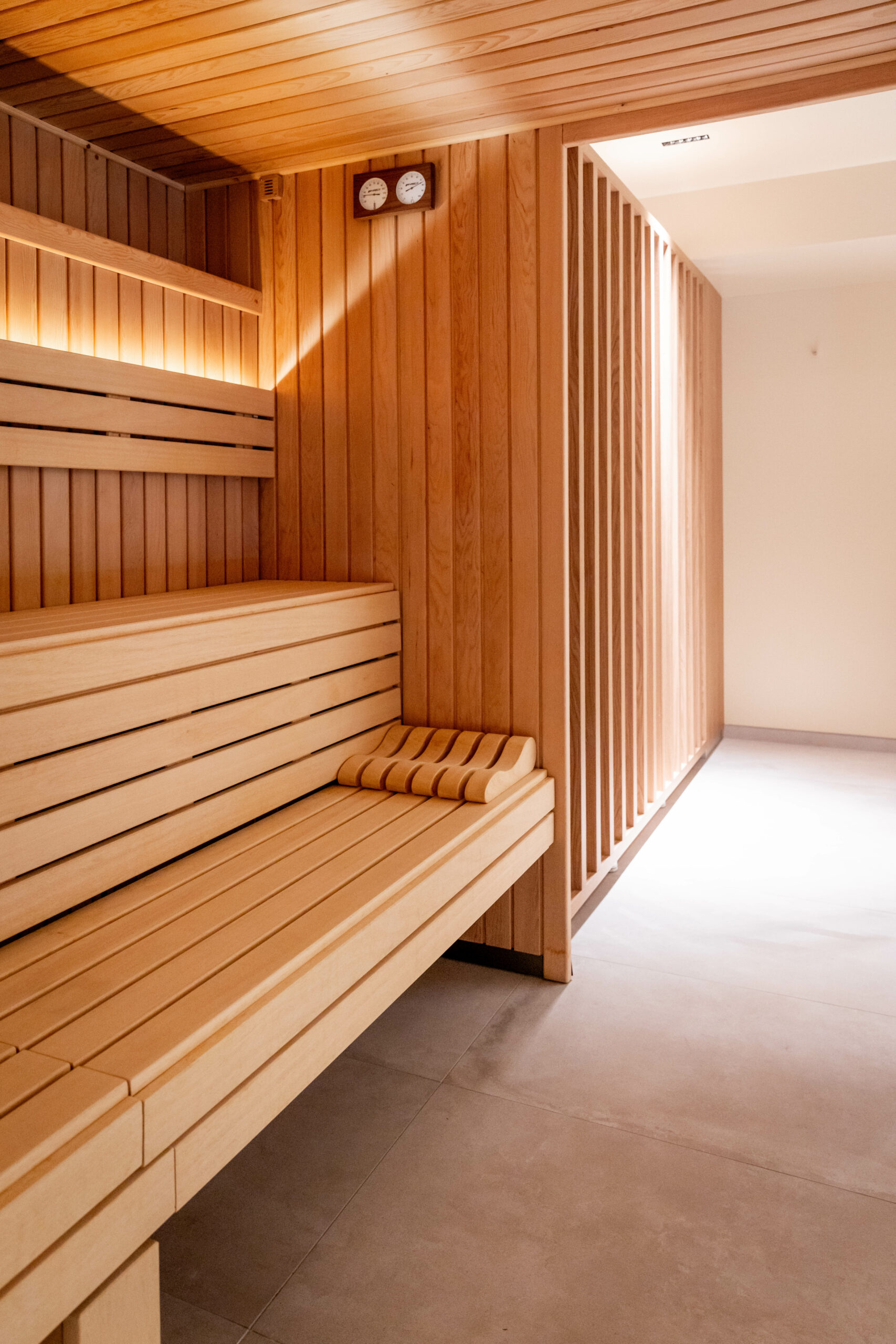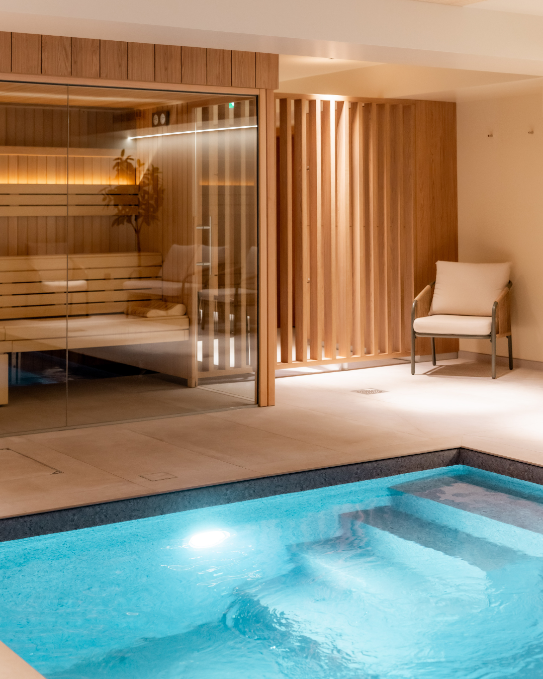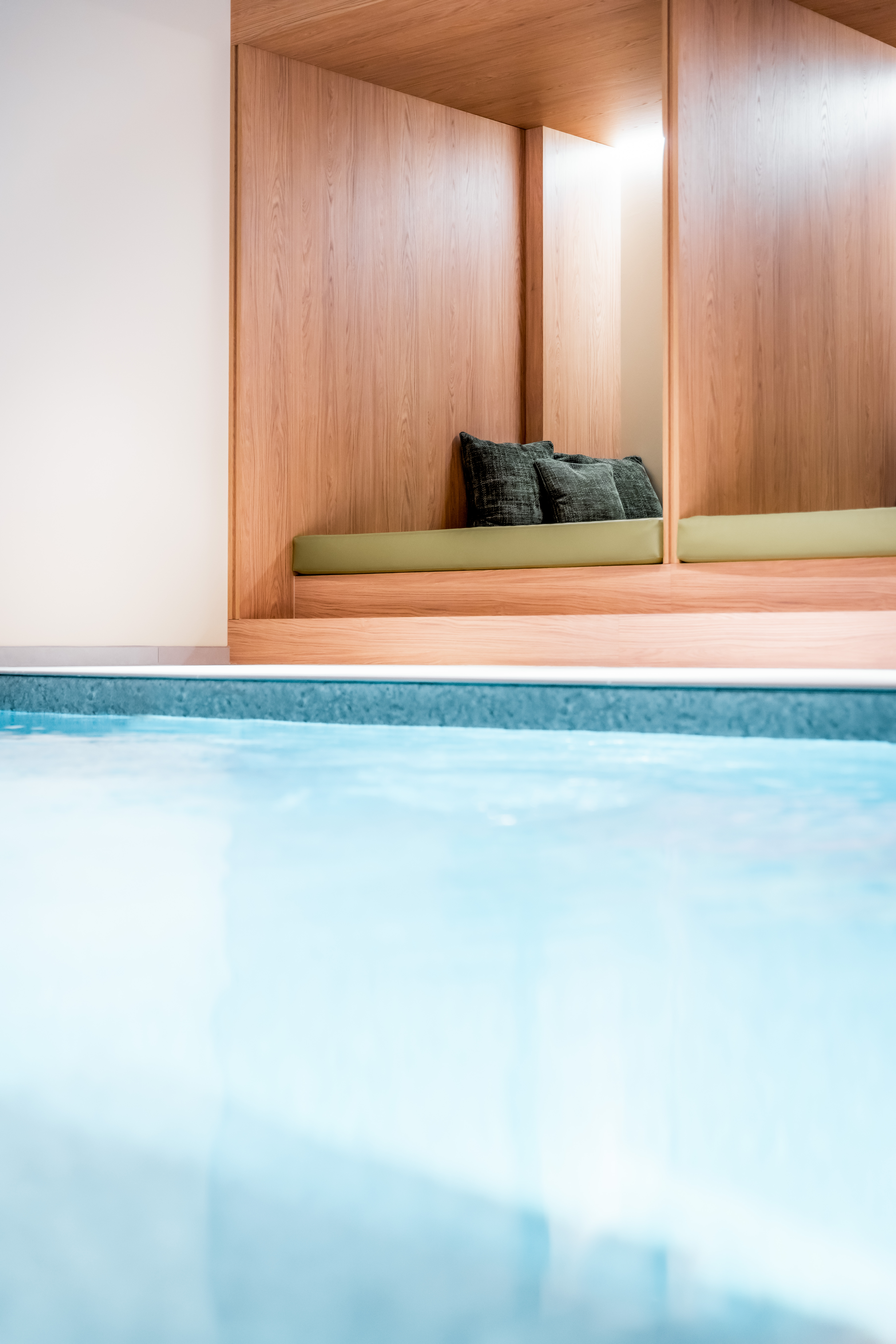 Un espace vestiaires conduit élégamment vers un agencement de tisanières et banquettes. Le parcours se poursuit au détour d’un meuble par la perspective d’accès aux installations de bien être ponctuées par une zone de repos donnant sur un bassin intérieur.
